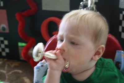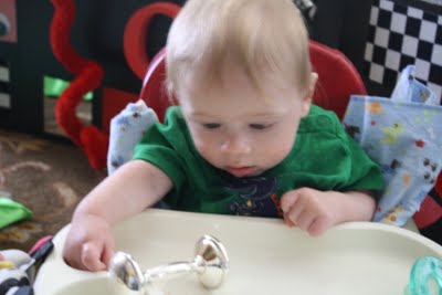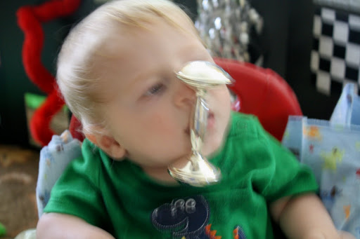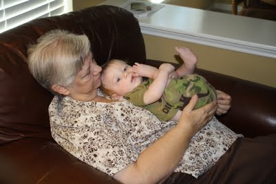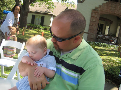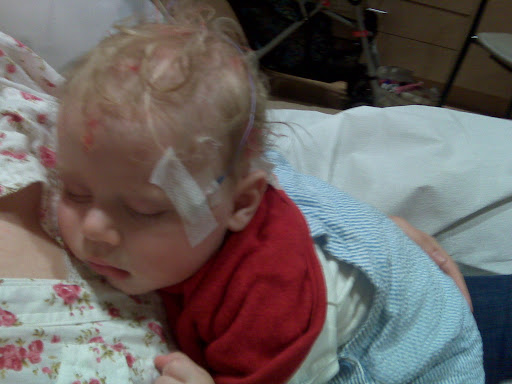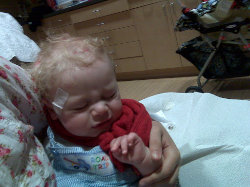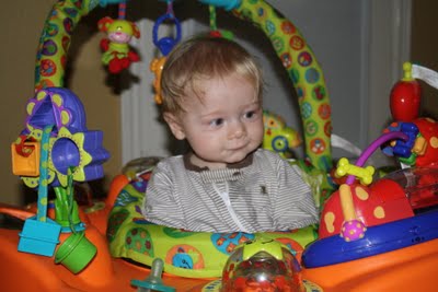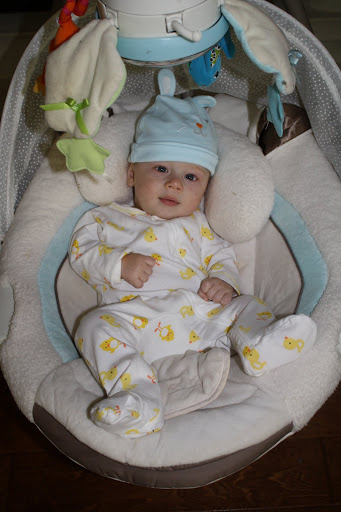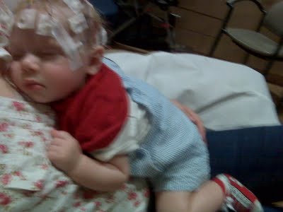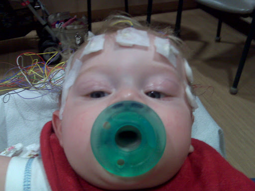 As of 10:30 this morning, Grayson weighs 14 pounds, 8 ounces. We are back up to the 1.5 percentile. So now only 98.5% of children his age weigh more than him. My little Heavyweight Champ was a pill while the nurse weighed him and checked his heart and oxygen (do you think his 2 specialist appointments, EEG and 2 blood draws the past few weeks have given him a complex?) but thankfully fell asleep so I could talk to the doctor without a screaming-soundtrack. We discussed his possible reflux (he gags, coughs and spits up a lot) so we are going to try Prevacid for a month to see if that makes a difference. I told her about his struggles with solids, which probably are just another developmental delay but if it doesn’t improve in a few months she might refer us to an ENT. We talked about his visits to the neurologist and the endocrinologist and I realized I now sound like I am reading a book when I talk about this stuff. She does not agree with the diagnosis of Septo Optic Dysplasia, because of the lack of evidence of a metabolic disorder. In fact, she had already been sent some of the results of the blood test from Monday! All of the blood and urine came back normal- no metabolic issues. We are still waiting on the chromosomal tests- I’m sure that will take awhile.