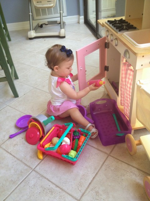 A friend of a friend passed down her play kitchen and shopping cart to Charlotte. She was smitten from the start. I tried to actually play “kitchen” with her- cooking, chopping vegetables- but all she wanted to do was dump out all the food and pots and slam the door over and over. Whatever.