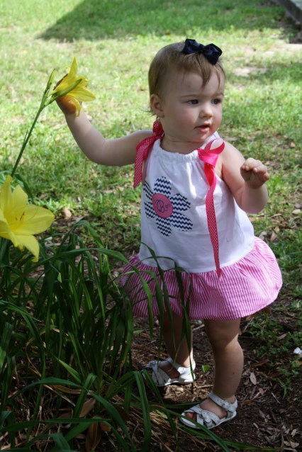 I just love this picture of Charlotte. We’re singing “If You’re Happy and You Know It”- can you tell? My mother in law made her cute dress and the monogrammed flower iron-on is from my favorite etsy store.