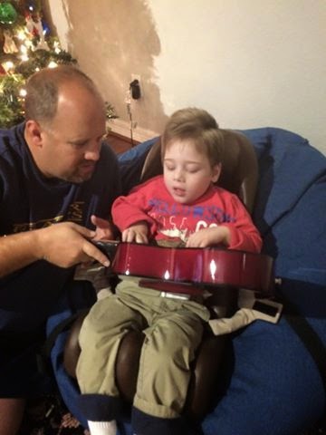 The North Pole had decorations, food and drink, a choir, orchestra, lots of presents, two Houston Texans, and of course, Santa! Poor Grayson barely made it back into his wheelchair before he was sound asleep. Even though he was asleep, we still got a good picture with Mr. and Mrs. Claus.