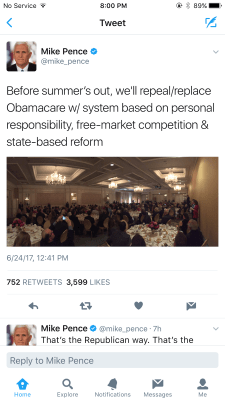 You may be right, that may be the Republican way, but I sure as hell hope you’re wrong about it being the American way. This is not the America I want to raise my children in, and they surely won’t be taught to embrace these values. Being sick or poor is not a character flaw. We are supposed to take care of each other; instead, you want only those who are rich, able-bodied, or have lived up to some arbitrary measure of “personal responsibility” to have the America you are making to be “great”. Well fuck that, Mr. Pence. I am angry, and I will stay angry and fight like hell for my child and all the children and Americans who are being screwed by this inhumane, ridiculous bill. That, I believe, is MY personal responsibility.